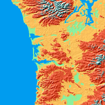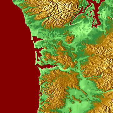 This is the database to use if you want to create your own color maps. Similar to the Grayscale databases, this database has improved accuracy. Use it to create stunning color relief images of the earth's land and ocean depths. Included with this database are example maps and a detailed discussion of how to produce your own color images. Channel 1 represents the earth's land with different shades of gray. The higher the area the lighter the color. Channel 2 contains the ocean floor. Channel 3 contains a mask for separating water from land. The resolution of this file is 12 pixels per degree. The file size is 26.7 MB and it comes on an CD-ROM disk. An 8 pixels per degree database and an image cropping program are also included.