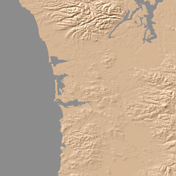 The Color Relief database is a color map of the Earth with highlights and shadows on the land and ocean floor. The resolution of this file is 12 pixels per degree. The file size is 26.7 MB and it comes on a CD-ROM disk. An 8 pixels per degree database and an image cropping program are also included.